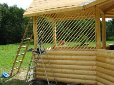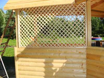 Несущая основа деревянной постройки – угловые брусья. Следует особо тщательно подойти к процессу установки основ, потому что на них будет держаться крыша. Стены можно сделать как сплошными, так и в виде решёток.