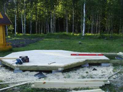 Основу напольного покрытия можно сделать из деревянных брусьев, которые следует скрепить между собой саморезами и досками. Если конструкция открытая, то желательно пол сделать немного с наклоном, чтобы дождевая вода не скапливалась, а вытекала наружу.