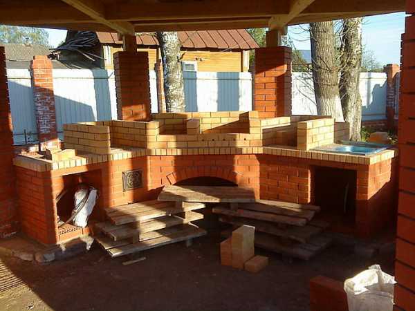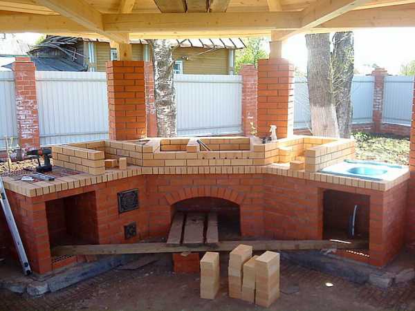 Ну и самый трудоемкий и сложный вариант беседки с мангалом и барбекю своими руками — «каминный» вариант печи из кирпича по индивидуальному проекту.
