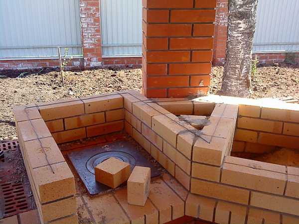 - В углу. Это расположение часто встречается в квадратных или прямоугольных беседках открытого или полуоткрытого типа с двумя стенами из кирпича, а также если беседка имеет в плане форму правильного многоугольника.