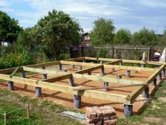 В нашем случае плодородный слой почвы имел толщину всего около 20 см. За ним шел отличный глинистый грунт. Постройка относительно небольшая, поэтому в качестве основания выбраны бетонные столбики. Землю под ними лучше выбрать и заменить ее на песчано-гравийную смесь. Так можно выровнять высоту.