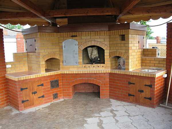 - Встроенная садовая кухня. Это целое сооружение, в котором предусмотрен гриль, плита, духовой шкаф, коптильня, тындыр. В этом случае под одной крышей собрана целая площадка для приготовления самой разнообразной пищи. Сложность его проектирования и возведения под силу только профессионалам и самостоятельно приступать к его постройке опасно. Следует сказать, что с точки зрения финансов такая печь обойдется очень дорого.