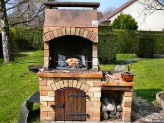 - Печка-мангал или печь-барбекю. Пищу в таких печах можно готовить на шампурах либо решетке. Возможно совместить печь с коптильней. Стационарную конструкцию с печкой возводят обычно встроенной в беседку. В деревянную беседку можно установить готовый мангал-печь из металла. Его возможно переместить при необходимости либо сделать обкладку кирпичом для капитальности.