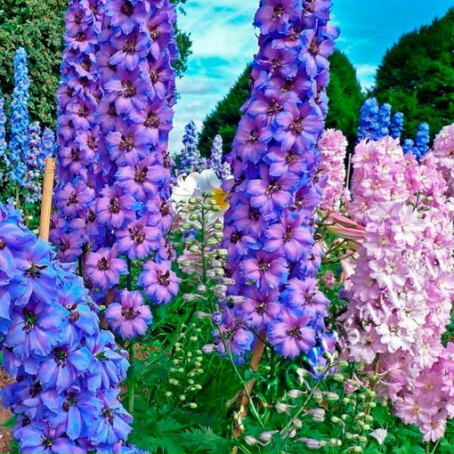 Также высокими декоративными свойствами и неприхотливостью отличается дельфиниум. Высота его может достигать 2 метров, вдоль верхней части стебля располагаются соцветия среднего размера. Растение устойчиво к заморозкам и засухе.