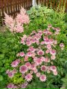 Что касается среднего яруса, то наряду с Хостами и Баданом высаживают многолетнюю и тенелюбивую Астильбу и Аквилегию. Астильба – это универсальное растение, что может расти практически везде и в любых условиях. Все же в идеале ее сажать в полузатененном участке. Дизайнеры ценят ее за прекрасные соцветия метельчатого вида, состоящие из небольших цветочков. Их окрас самый разный: розовый, красный, белый, сиреневый, светло-желтый. Начинает цвести летом.