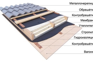 Совет! Использование гидроизоляционного материала на основе битума (рубероид) обоснованно только в конструкции холодной крыши, но в этом случае между металлочерепичным покрытием и слоем гидроизоляции должно оставаться пространство для вентиляции и отвода конденсата.