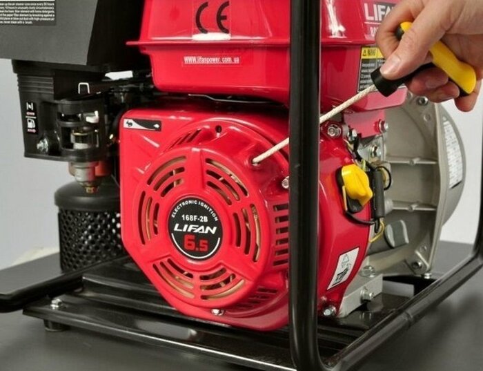 2-х тактный двигатель не требует заливки масла в картер двигателя. В таком двигателе в качестве топлива используется смесь масла и бензина. В этом состоит ключевая особенность таких моделей — заправляем их топливной смесью в соотношении бензин 25–30 частей и масло 1 часть (эквивалент литрам в зависимости от объема заливки). Очевидно и практическое удобство 2-х тактных мотопомп — их компактность, самые скромные по габаритам представители бензиновых мотопомп.