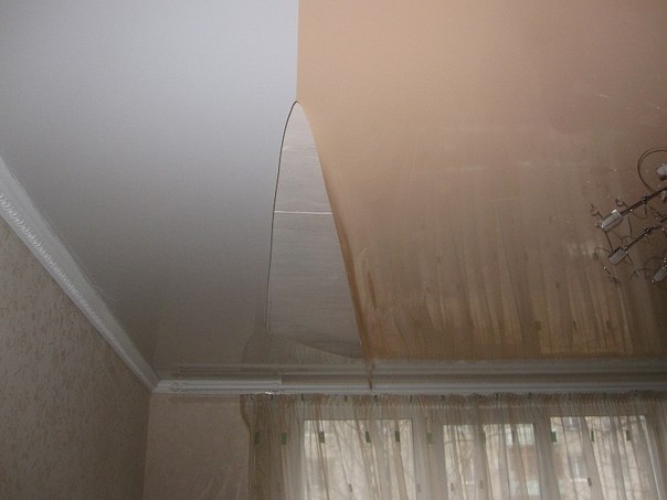 Затопление от соседей и провисание натяжного потолка требует немедленного ремонта. Потребуется демонтировать потолочные светильники и слить воду. При отсутствии осветительных предметов или емкостей, отсоедините полотно от вспомогательной конструкции. Впрочем, с этой задачей лучше справятся профессионалы.