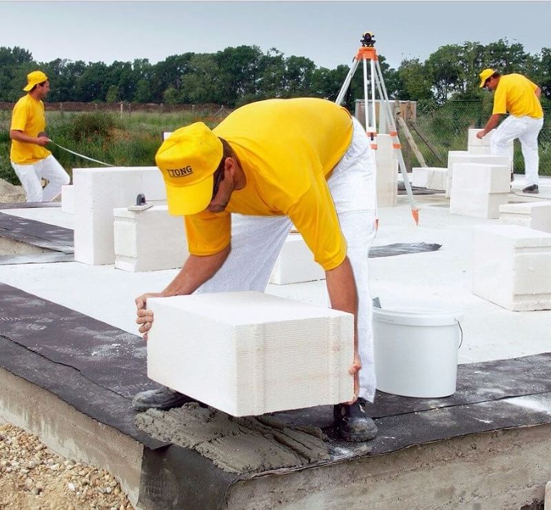 Для выполнения кладки с целью сохранения теплопроводных свойств материала, используется специальная кладочная смесь для пеноблоков, а для первого ряда – рекомендуется использовать цементные растворы, для более прочного, надежного соединения с конструкцией фундамента.