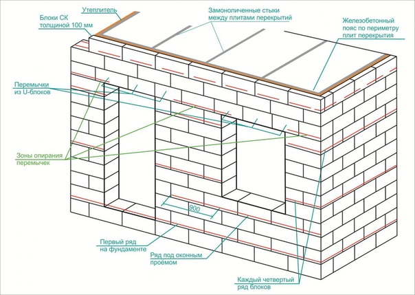 - многослойный способ, для которого характерно, что кладка пеноблоков в два ряда проводится гибким соединением, когда неперевязанные слои пеноблоков укрепляются металлическим стержнями, сетками.