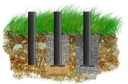 - Пробурить скважины на 50—60 см ниже границы промерзания, поставить металлические столбы и забетонировать. Причем слой бетона не должен подниматься выше этой границы, а остальную полость нужно засыпать щебнем и песком с трамбовкой.