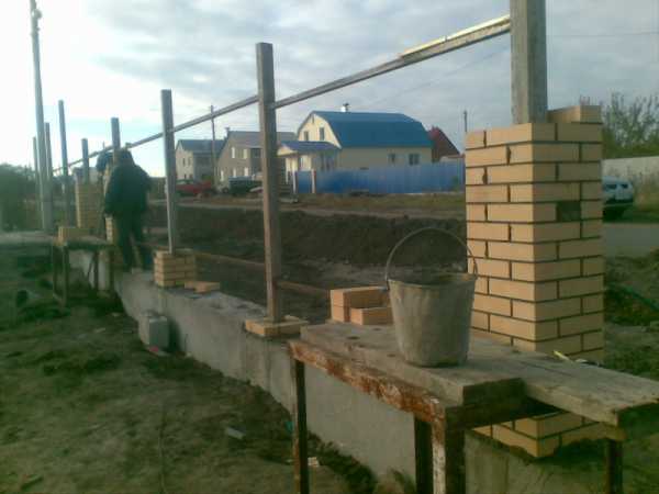 Сваям, имеющим точку опоры, нестрашны ни вертикальные, ни боковые воздействия. Для распределения веса ограды их оголовки объединяются одной бетонной плитой – ростверком, от которого начинается кирпичная кладка.