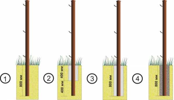 Выбрав столбы из подходящего материала, нужно определить, каким способом их укрепить в грунте. Это будет зависеть от типа забора, но в большей степени от характера грунта на огораживаемом участке. Выделяется четыре основных способа установки столбов для забора: