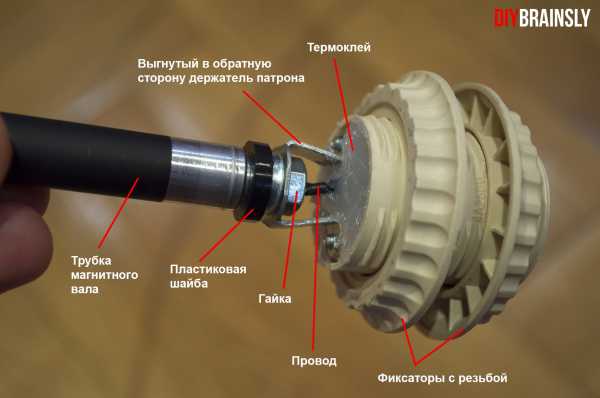 Затем я протянул провода через трубку. В ней сделал соединение проводов от патрона с кабелем ШВВП 2×0.5. Хорошо заизолировал и аккуратно спрятал, залил везде термоклеем. Чтобы отцентрировать конструкцию, я подложил пластиковую шайбу на месте соединения вала и патрона.
