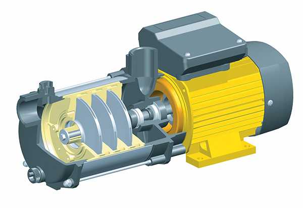 Внутри корпуса двигателя размещено вращающееся металлическое колесо, состоящее из пары дисков, соединенных между собой лопастями, изогнутыми под углом. При попадании воды на лопасти начинается вращение колеса, и создается центробежная сила, которая выталкивает жидкость под большим напором.