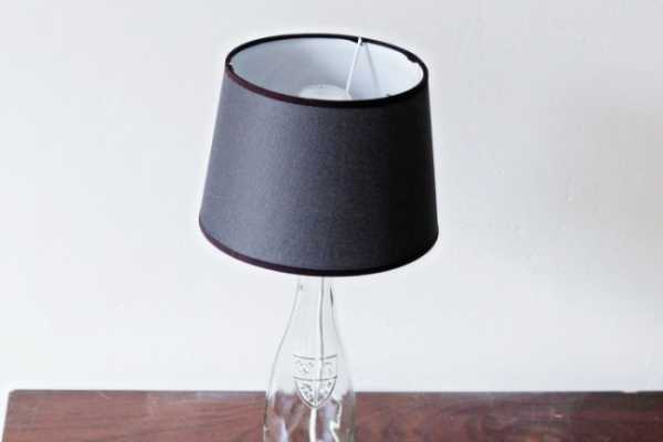 …пропустила через нее провод, соединенный с цоколем. Все скрепила двухкомпонентным клеем. Все бы ничего, но когда стала крепить абажур, то оказалось, что он не прячет ту часть горлышка бутылки, которая должна была быть под абажуром.