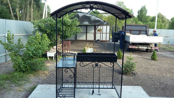 - Мангал на террасе под автономным навесом. Конструкция выполнена из металла.