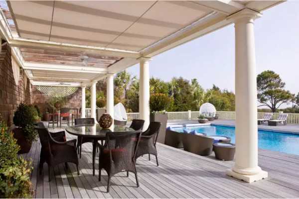 Раскладная маркиза, затеняющая большую площадь — незаменимый аксессуар для террасы