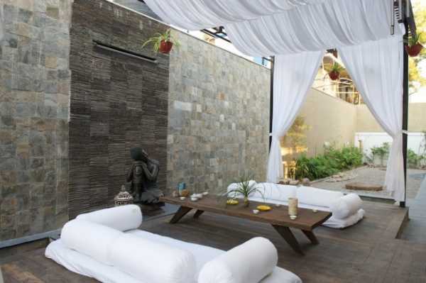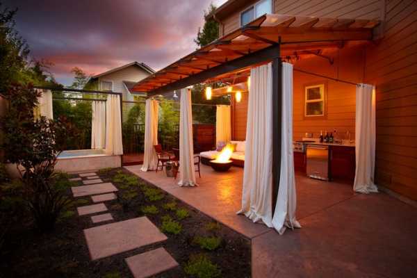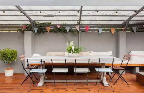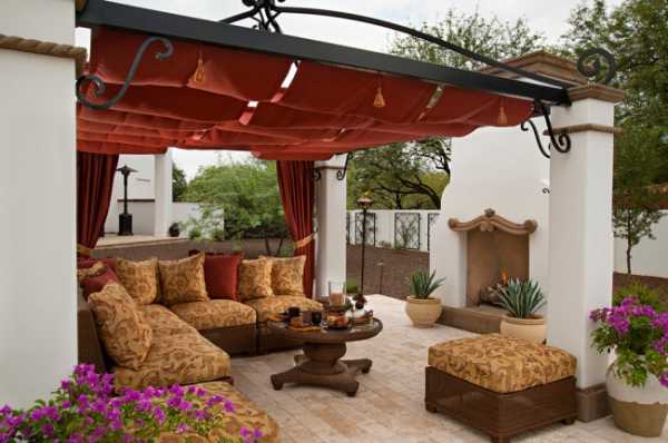 Поиграв с выбором цвета материи и материала каркаса, можно задать стиль террасе: от непритязательного пляжного до роскошного восточного