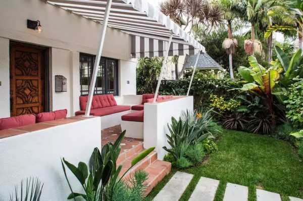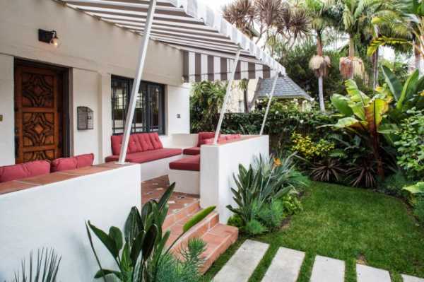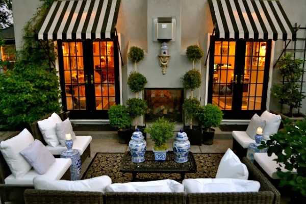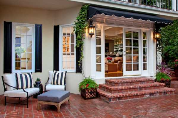 Самый традиционный вид солнцезащитного тента-маркизы — отрытый, из полосатой материи, придаст особый шик экстерьеру вашего дома