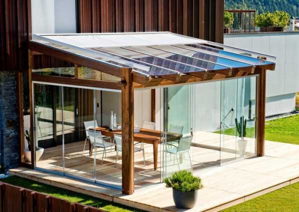 Современная открытая маркиза для жилых домов. Ее навес может состоять не из материи, а из стекла или даже солнечных батарей