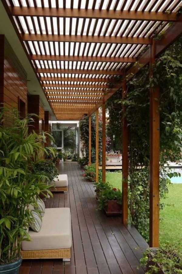 Отличную тень создает пергольная конструкции. Она оснащена стойками, которые позволяют монтировать вертикальное ограждение. Жесткость подобной конструкции не позволяет возникать деформации при ветровой нагрузке.