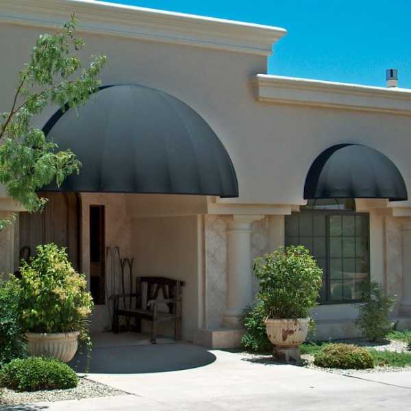 Купольные (или корзинные) навесы-маркизы одинаково популярны и для частных домов, и для торговых точек. Очень декоративно смотрятся такие маркизы над окнами или стеклянными панорамными витринами магазинов