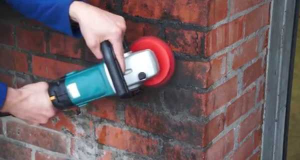 - Подготовка заключается в удалении старой штукатурки, наплывов кладочного раствора, краски, а также пыли и загрязнений. Проще всего зачистить поверхность своими руками с помощью угловой шлифмашинки. Швы между кирпичами углубляют на 0,5-1 см.