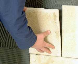 - на сплошное, т.е. на поверхность наносится состав, не оставляя пузырей и пустых мест, толщиной примерно 1 см, разглаживается специальным зубчатым шпателем, и на него прикрепляется плитка ряд за рядом;