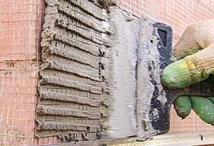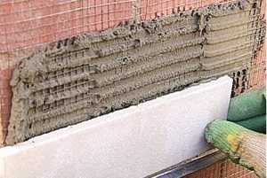 - При нанесении второго слоя обязательно используют уровень и отвес. Раствор наносят мастерком и разглаживают так, чтобы сетка была полностью закрыта раствором.