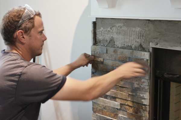 Технология облицовки печей декоративным камнем или плиткой примерно аналогична. Начинать стоит с нижнего ряда от внешнего угла печи, который нужно максимально выровнять. Плиточный клей намазывается на саму поверхность и немного на внутренний слой плиты, все проверяется уровнем.