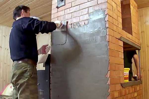 Тут применяется любой жаропрочный состав для базового оштукатуривания стен. Раствор накидывается на сетку и выравнивается шпателями, двигаясь снизу наверх.