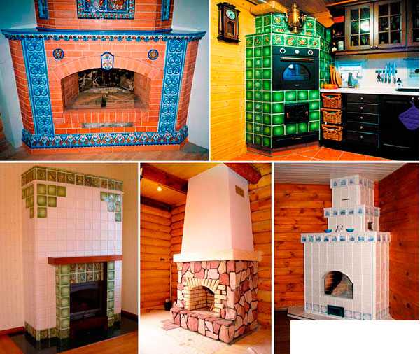 На фото показаны варианты, какой плиткой можно обложить печку.