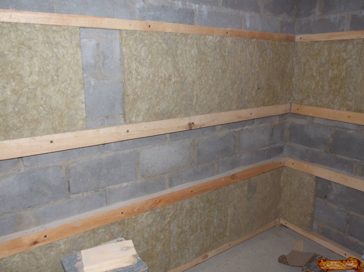 В первую очередь следует подготовить обрешетку.Поскольку комната бани и парилки небольшая, обрешетка тоже будет сделана просто путем набивки рейки на каркас теплоизоляционного слоя.