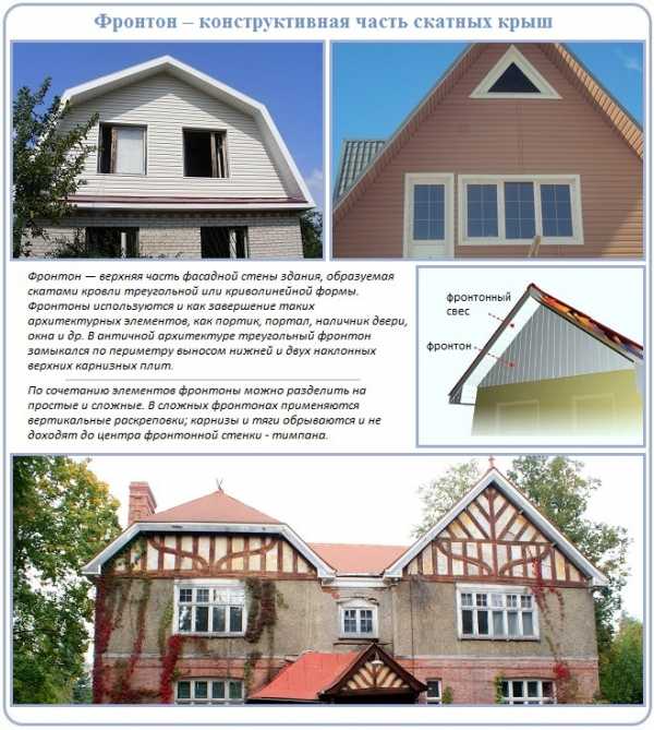 Фронтоном называется верхняя часть стены строения, ограниченная снизу потолочным перекрытием, сверху – плоскостями одной из скатных конструкций. Это неизбежные спутники строительства двускатной, ломаной, односкатной или датской четырехскатной крыши.