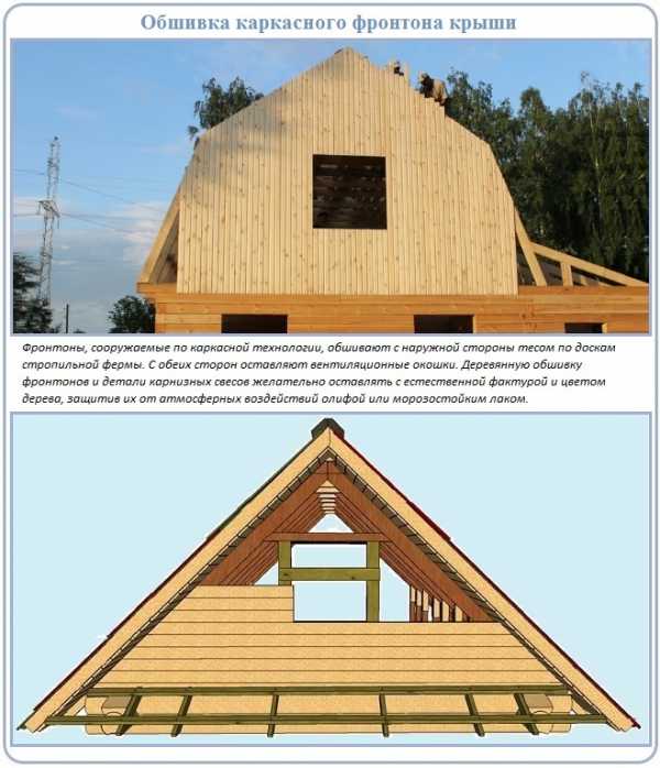 Фронтоны с обшивкой из пиломатериалов устраивают по каркасной технологии. Т.е. сначала сооружается каркас фронтонной стенки, на который затем нашивается брусок, обрезная либо шпунтованная доска. Нередко фронтонные стойки служат основой для устройства обрешетки, по которой производится монтаж профлиста, сайдинга и подобных материалов.