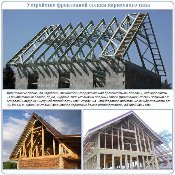 В зависимости от материала, из которого выполнены стены обустраиваемой коробки, каркасные фронтоны опираются на верхнюю обвязку, мауэрлат или балки перекрытия. В случае устройства свесов шириной до 30 см они формируются выносом обрешетки.