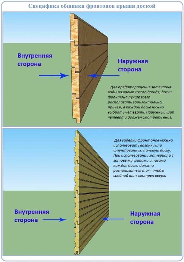Заделку фронтона начинают с самой нижней доски, на домах с фронтонным отливом с бруска, установленного вдоль линии сопряжения отлива с фронтонной стенкой. Обязательно располагать доски пазом вниз, хоть и крепить подобным образом в шпунт неудобно. При обратном расположении атмосферная вода запросто затечет в соединение и будет способствовать загниванию.