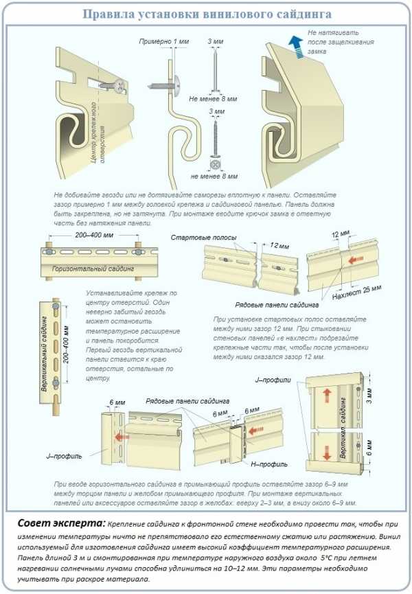 - Между шляпкой гвоздя или самореза и виниловой обшивкой должен остаться зазор минимум в 1 мм. Плотно затянутый винт нужно ослабить на пол-оборота. Скобы и гвозди не следует добивать до предела.