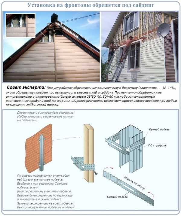 При креплении полимерных панелей к кирпичным, бревенчатым, пенобетонным стенкам перед обшивкой фронтонов крыши устанавливается обрешетка. Она выровняет неидеальные поверхности и сформирует вентиляционный зазор, значительно продлевающий жизненный цикл примененных в сооружении короба стройматериалов.