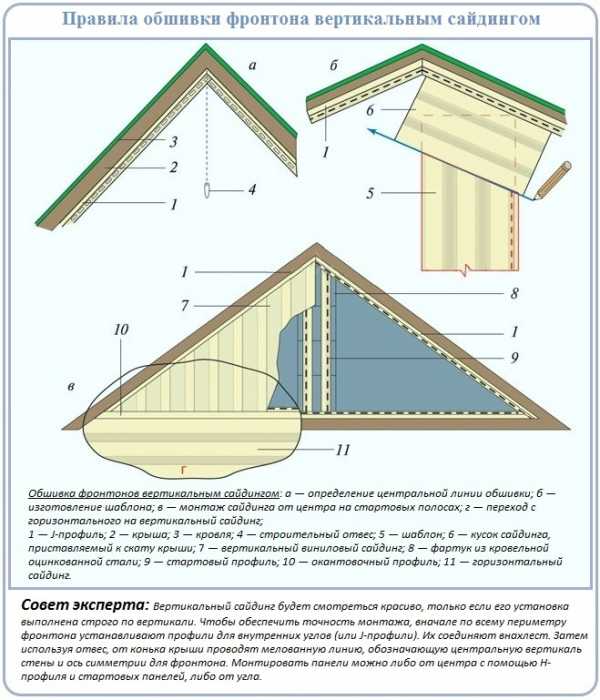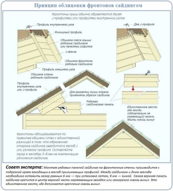 Монтаж панелей, раскроенных по сделанным по фактическим данным шаблонам, начинают исключительно от угла, если центральная ось оснащалась спаренными J-профилями. При использовании Н-профиля в центре фронтона, монтировать виниловые панели можно как от угла, так и от центра.
