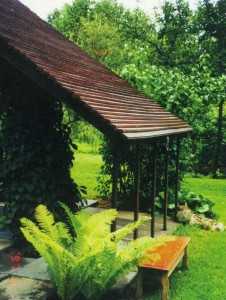 Небольшая крыша декоративного навеса покрывается без обрешетки, что означает набить доски внахлест прямо на стропила. В этом случае крыша снизу имеет тот же рисунок, что и сверху, да и расход строительного материала будет значительно меньше, впрочем, как и самой работы.