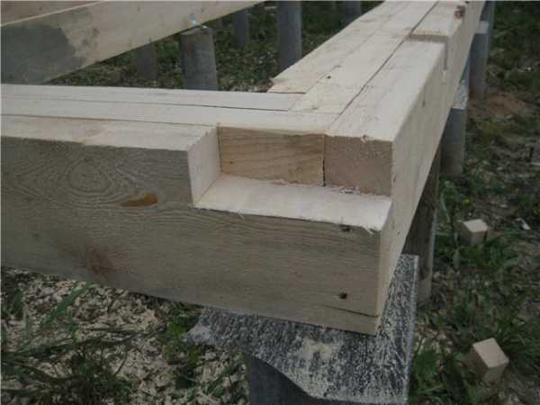 - набираем брус самостоятельно из одной целой доски сечением 50х100 мм и обрезков. Набор идет таким образом, чтобы опорные вертикальные балки размещались в пазах по всей ширине, только для формирования оконных и дверных проемов в балках готовятся пазы 50 мм;