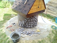 - Каменный. Это трудоемкий и дорогостоящий способ отделки оголовка колодца. Но результат получается очень красивым и солидным. К тому же такой отделочный материал не требует никакого ухода и сохранится в первозданном виде многие десятилетия. Из камня можно выложить целую стену вокруг колодца, либо же только декорировать им оголовок колодца из бетонных колец. Во втором случае стоимость снизится в несколько раз, а внешний вид не проиграет.
