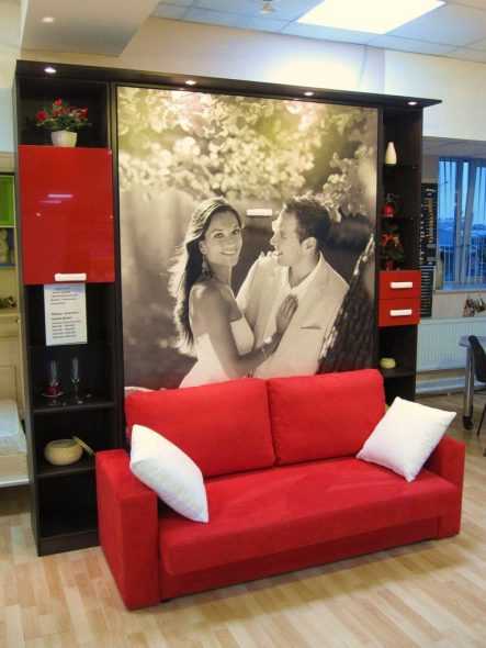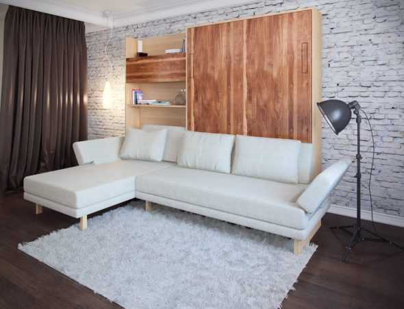 Интересным решением в интерьере является использование подъемной кровати с диваном. Этот вид мебели набирает все большую популярность. Суть конструкции заключается в том, что кровать поднимается на пружинах или газовых амортизаторах вертикально и выглядит как дверцы шкафа.