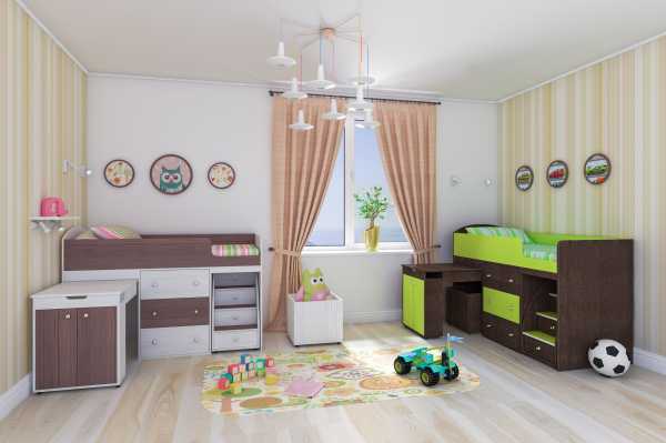 Двухъярусные кроватки сохраняют ещё больше площади как в игровой, так и в зале. К тому же, к верхнему этажу прикреплена лестница, что тоже складывается превосходно.