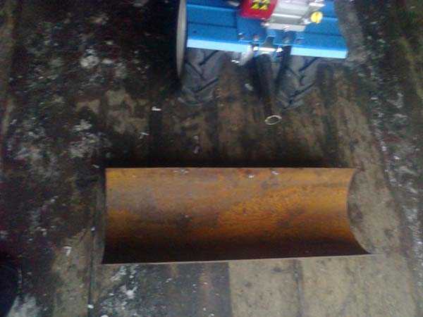 - Далее возьмите такой же кусок трубы и сделайте из нее держатель, напоминающий по форме букву «Г». Один из концов держателя аккуратно вставьте в одно из отверстий в полукруге, а второй конец надежно закрепите на раме мотоблока;