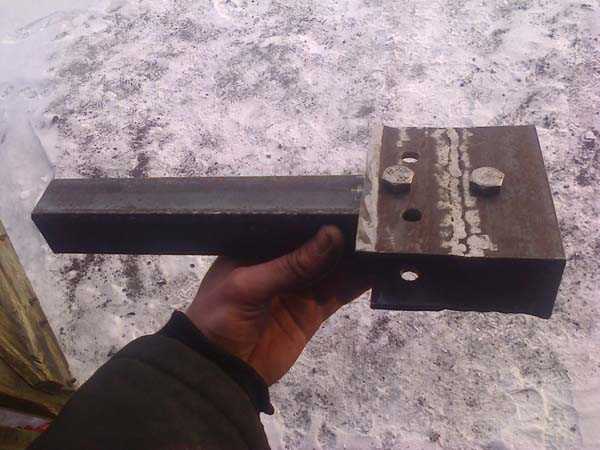 - Следующим шагом станет изготовление и монтаж механизма крепления. Отрежьте кусок трубы, сечением 4×4 см и приварите его к тыльной стороне ковша примерно посередине элемента. В средней части трубки приварите деталь в форме полукруга – для этого возьмите толстый кусок стали. В полукруге проделайте 3 одинаковых отверстия, которые в дальнейшем понадобятся для вкручивания болтов;
