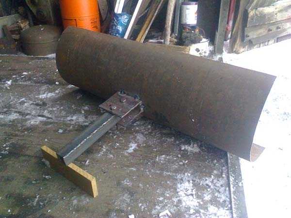Затем снегоочистительный отвал для мотоблока усиливают крепежной конструкцией: квадратной трубой размером 40*40 мм, которую приваривают к средней части скрепленных между собой сегментов бочки. После этого к середине трубы монтируют стальной полукруг с тремя отверстиями для фиксации поворотных углов лопаты.