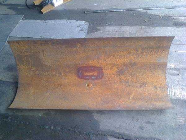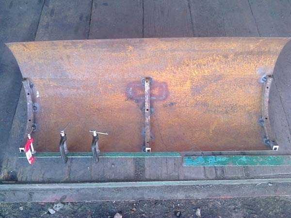 - В первую очередь сделайте заборный ковш. Для этого возьмите ребра жесткости и сварите с них каркас с тремя горизонтальными и четырьмя вертикальными направляющими .Далее нагрейте газовой горелкой стальные листы и аккуратно согните металл таким образом, чтобы он получил форму ковша. Готовый элемент приварите к каркасу из ребер жесткости. В итоге у вас должен получиться снежный отвал идентичный тому, что показано на фото;